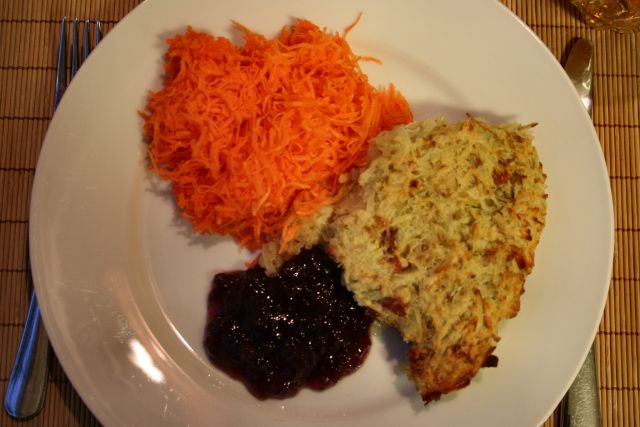 Ät med lingonsylt och rårivna morötter. Fläsket kan bytas mot bacon eller tärnad, kokt skinka. För den som vill undvika fett är det här ett bra sätt att göra raggmunkar. |